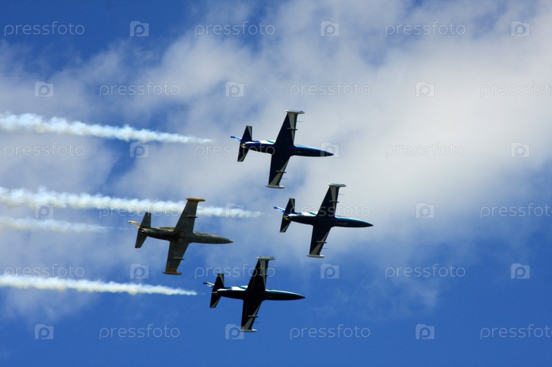 Четыре самолета, летящие на фоне голубого неба