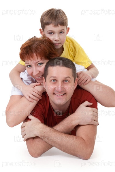 Мама, папа и сын лежат на белом фоне