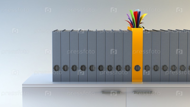 Яркая папка с наклейками среди серых папок