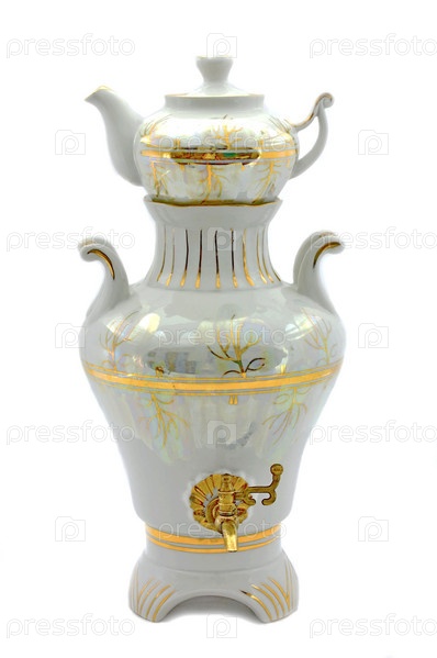 Русский самовар из фарфора на белом фоне