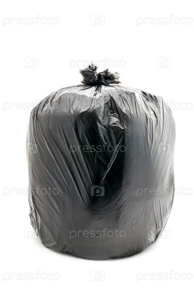 Полный черный мешок с мусором на белом фоне
