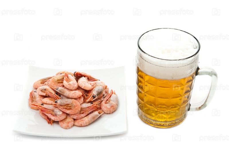 Свежее, холодное пиво с креветками. Изолировано на белом фоне