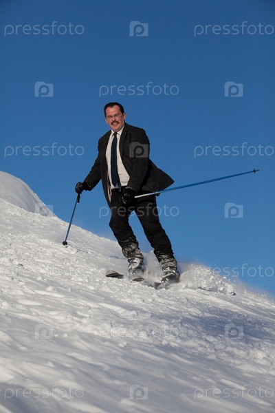 Мужчина в деловом костюме на горных лыжах