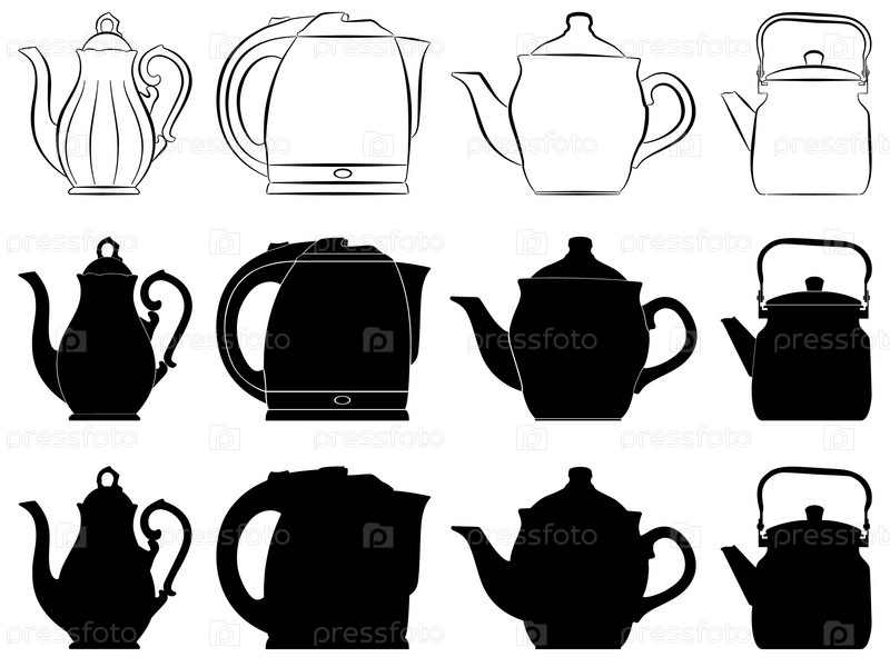 Векторное изображение чайников в виде силуэтов и контуров