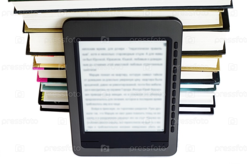 Электронная книга и обычные книги, изолированные на белом фоне