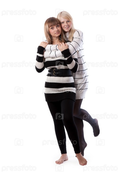 Две обнимающиеся девушки на белом фоне