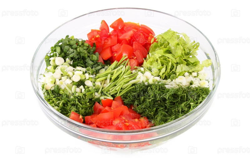 Салат из свежих овощей в стеклянной миске на белом фоне