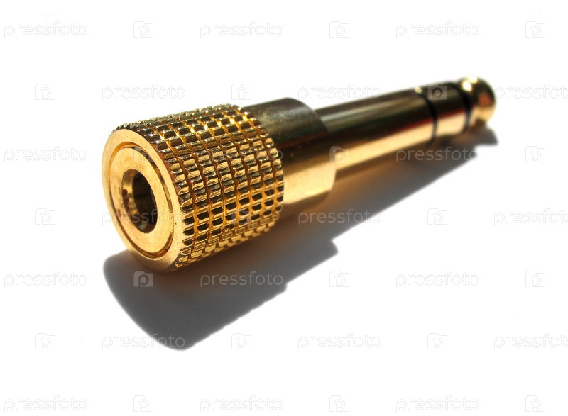 Золотистый штекер питания на белом фоне с тенью