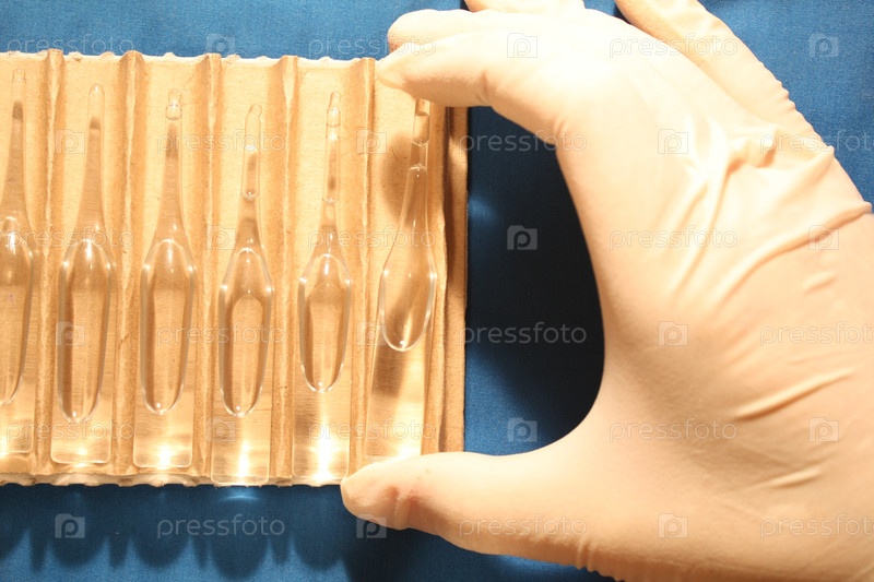 Рука в перчатке берет ампулу с лекарством из упаковки