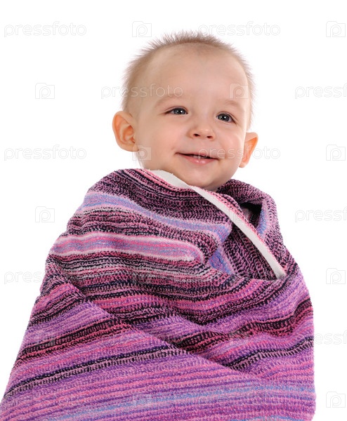 Симпатичный мальчик, завернутый в полотенце, на белом фоне