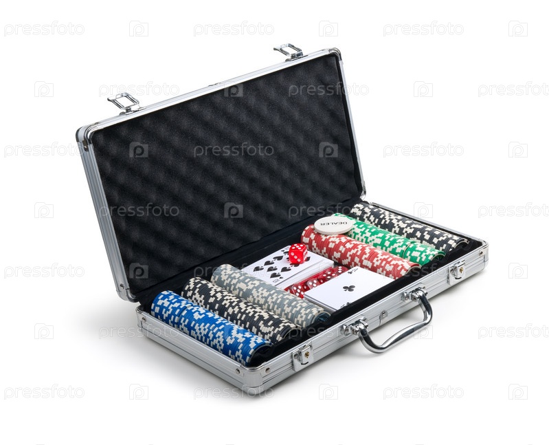 Набор для покера в металлическом портфеле на белом фоне
