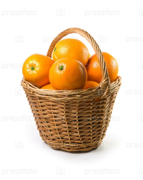 Зрелые апельсины в корзине на белом фоне