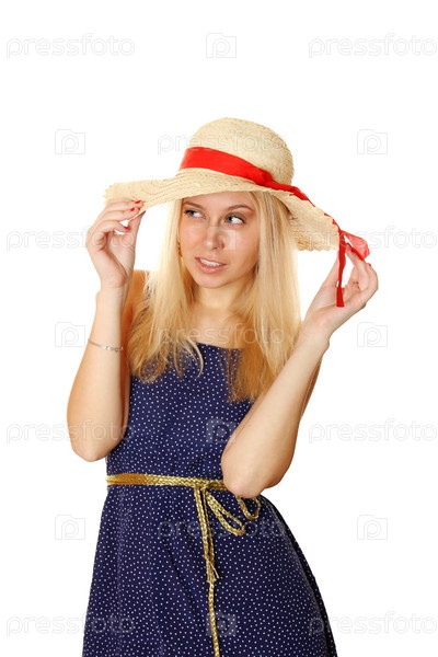 Молодая белокурая женщина в соломенной шляпе и летнем платье