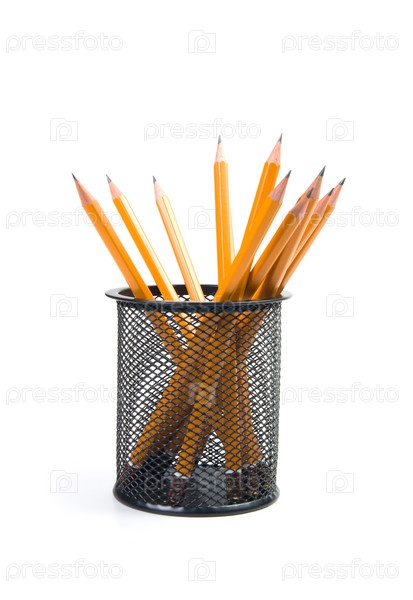 Черная подставка с карандашами на белом фоне
