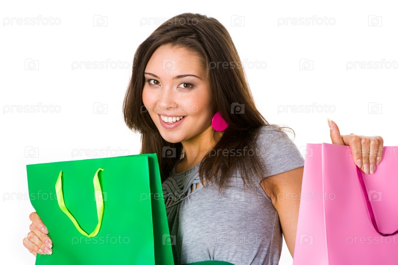 Портрет позитивного покупателя, держащего сумки в руках и улыбающегося на камеру