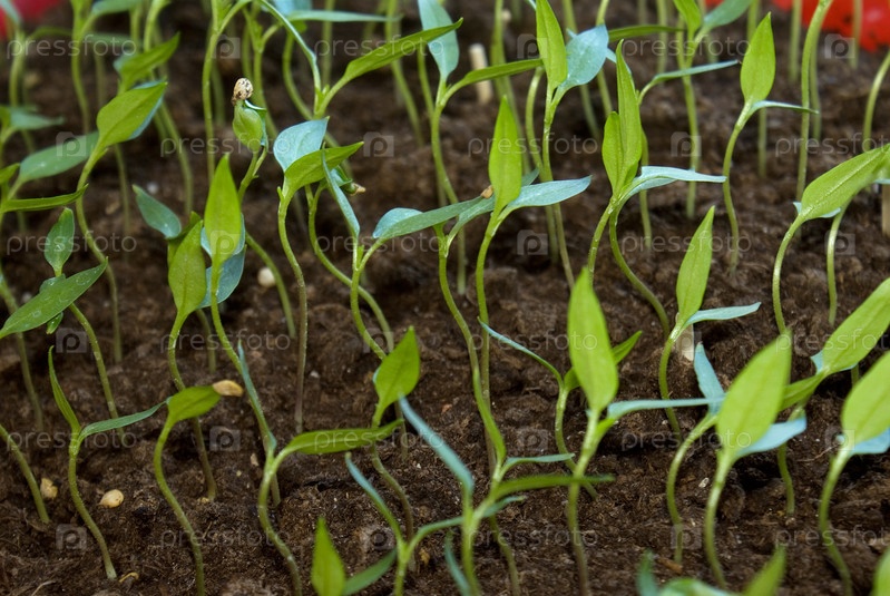 Молодая рассада болгарского перца в плодородном грунте