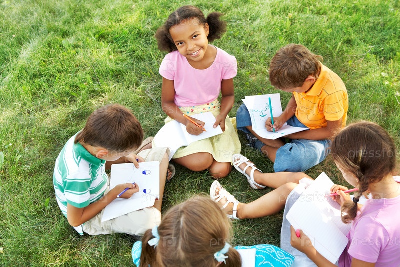 Дети сидят на траве и рисуют