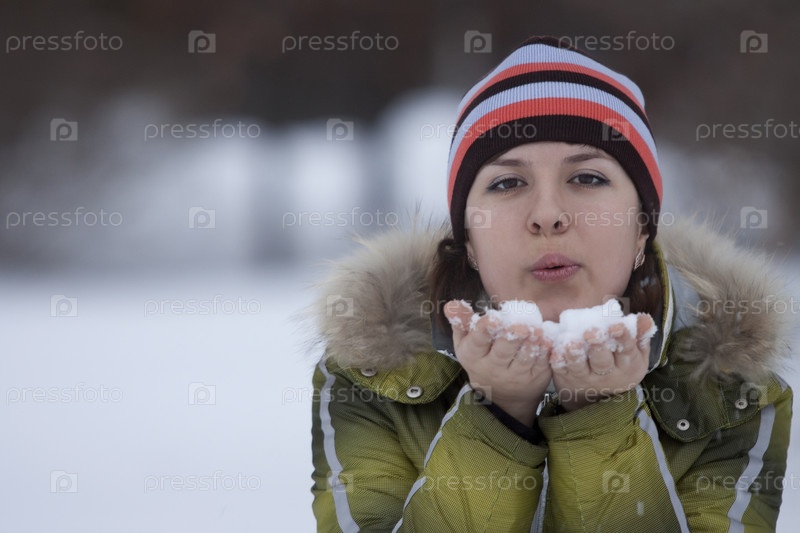 Девушка в зимней одежде держит снег на ладонях
