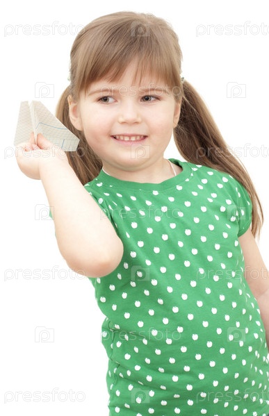 Маленькая девочка с бумажным самолетиком на белом фоне