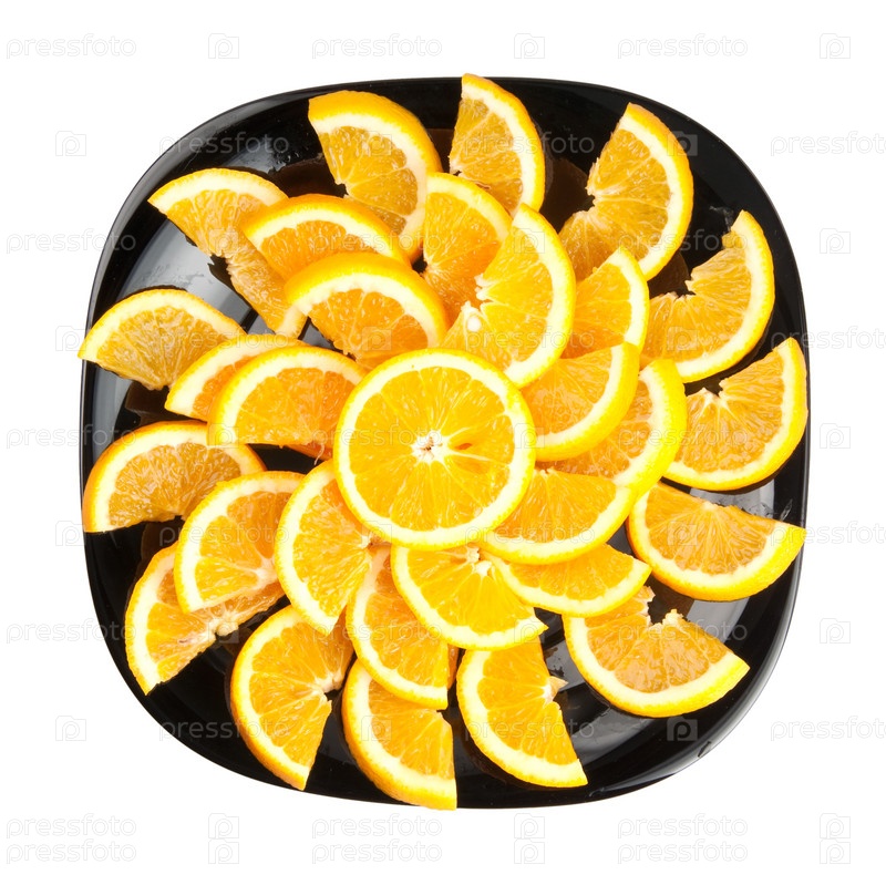 Черная тарелка с нарезанным апельсином, на белом фоне