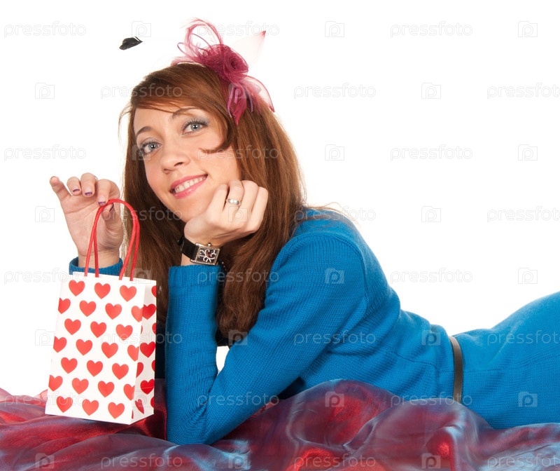 Девушка с пакетиком на белом фоне