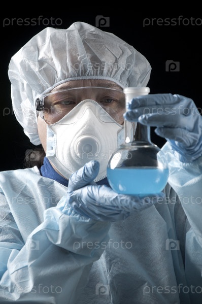 Ученый в защитном костюме работает с реактивами