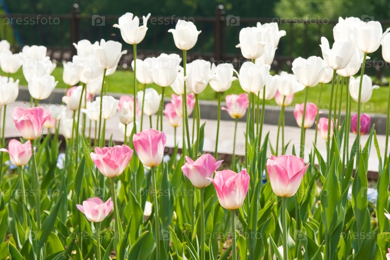 Клумба с белыми и розовыми тюльпанами