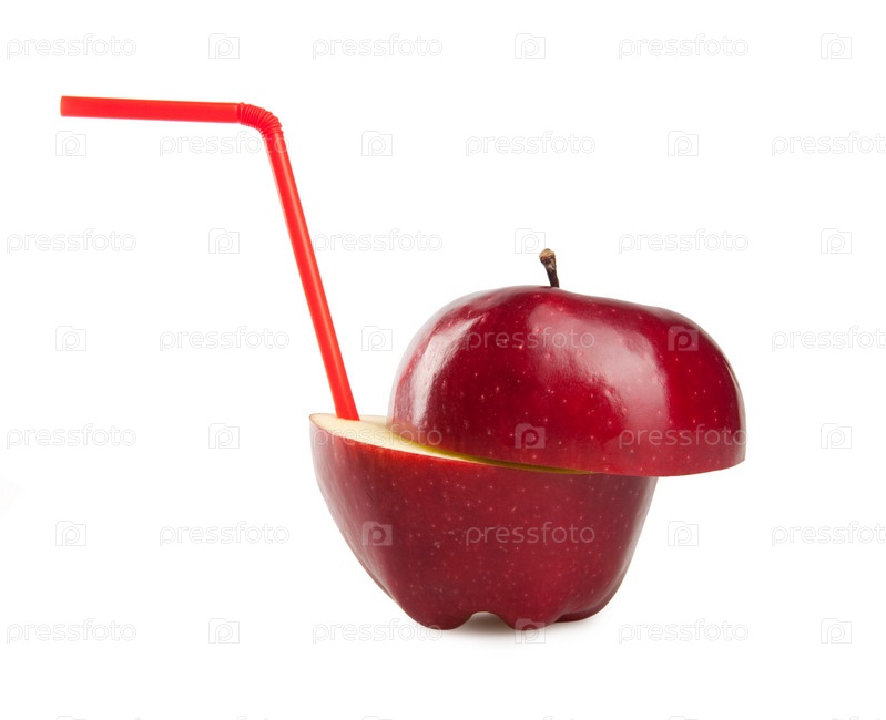Разрезанное красное яблоко с трубочкой, изолированное на белом фоне