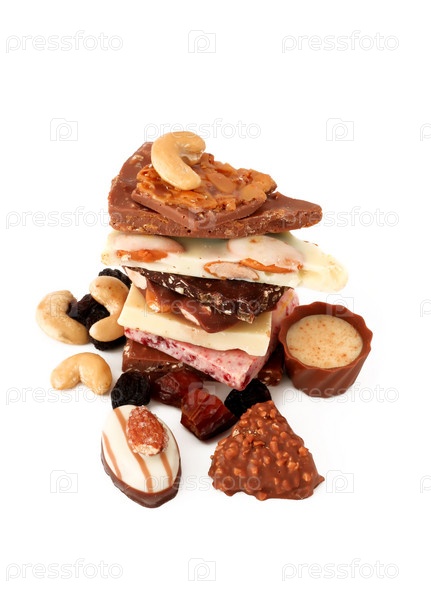 Кусочки шоколада, конфеты, орехи и изюм изолированы на белом