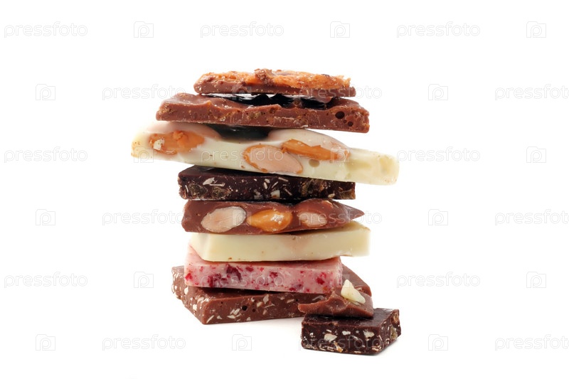 Кусочки разного шоколада изолированы на белом