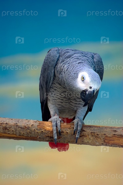 Африканский серый попугай (Psittacus erithacus) сидит на толстой ветке