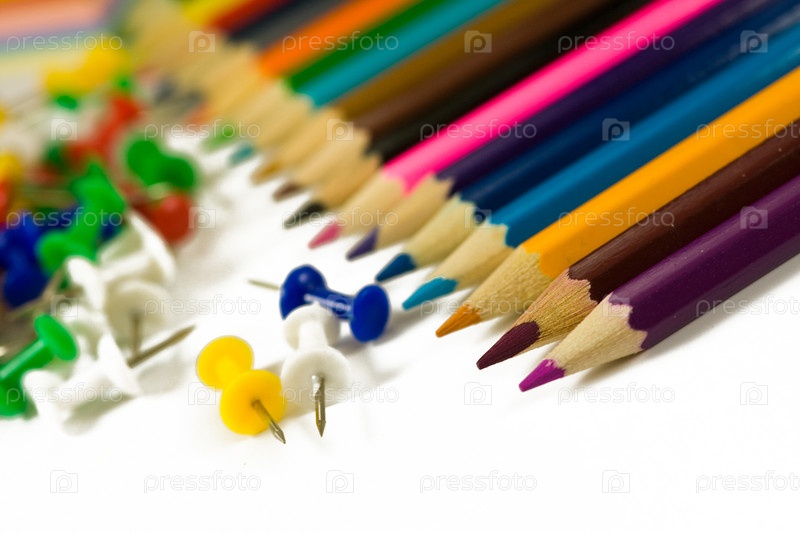 Цветные карандаши и канцелярские кнопки на белом фоне