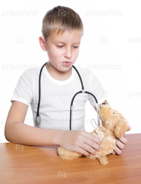 Очаровательный будущий врач 7-летний мальчик изолированный на белом