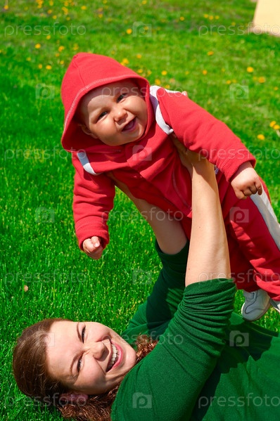 Молодая мать и ее ребенок на зеленой траве. Они улыбаются. Зеленый фон. Красная одежда на ребенке. Лето