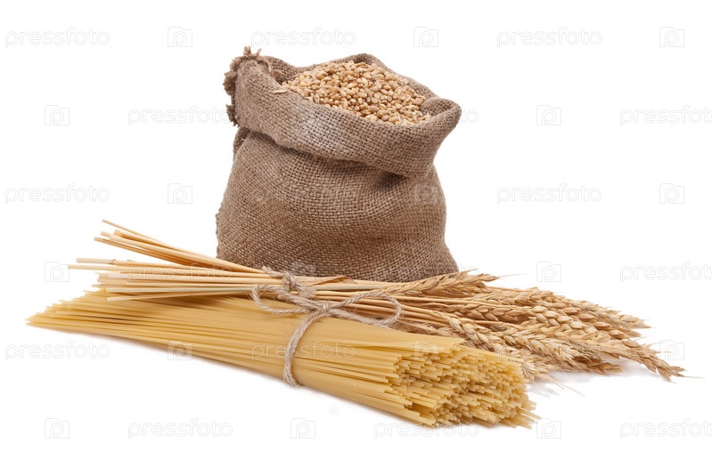 Колосья, макароны и мешок зерна на белом фоне