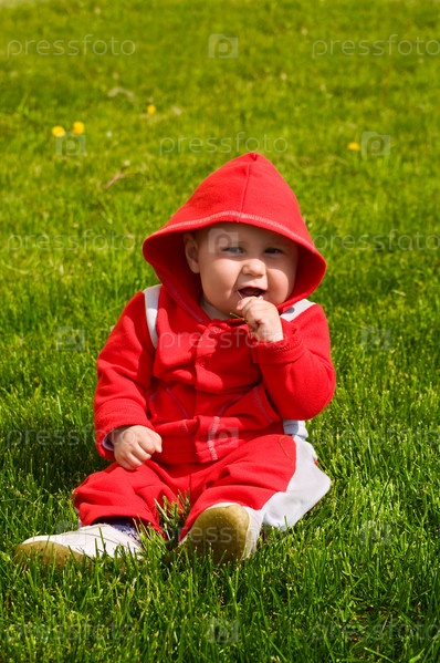 Ребенок в красной одежде сидит посреди зеленой травы и улыбается