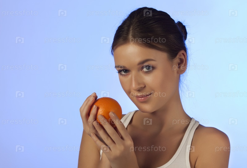 Милая девушка с апельсином в руках