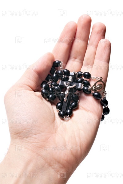 Черные деревянные четки и распятие в руке на белом фоне