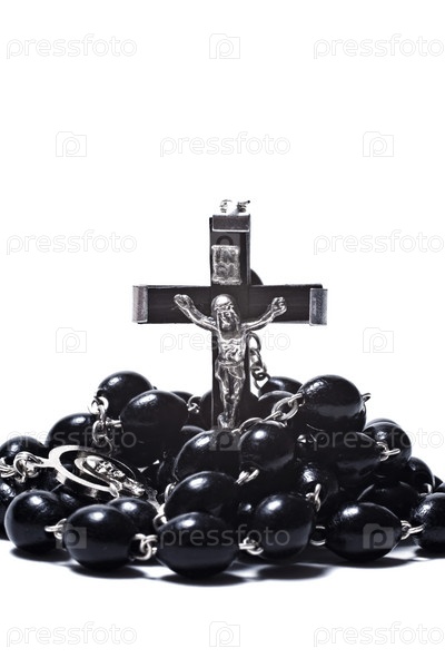 Черные деревянные четки и распятие крупным планом на белом фоне