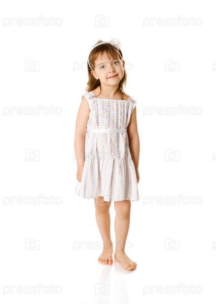 Маленькая босая девочка стоит, изолированная на белом фоне