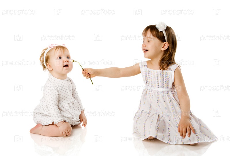 Две сестренки играют с цветком, изолированные на белом фоне