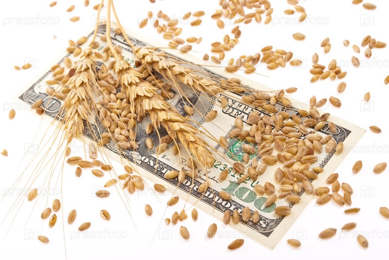 Пшеница и стодолларовая купюра на белом фоне