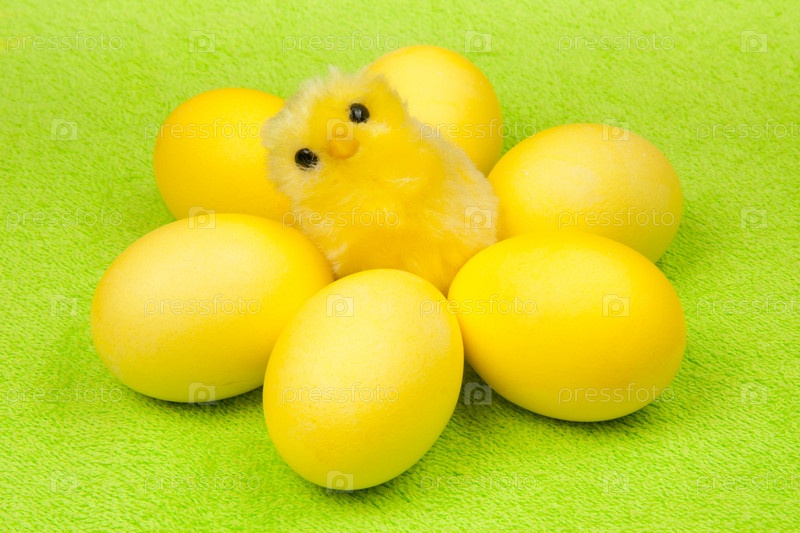 Желтый цыпленок и пасхальные яйца на зеленом фоне