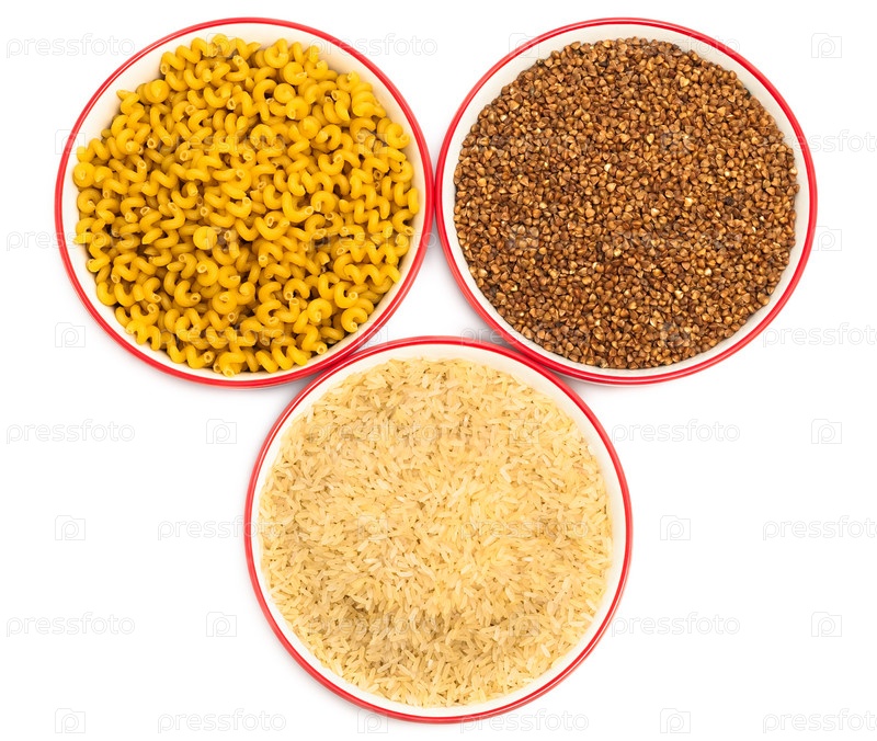Три чаши с крупами и макаронами