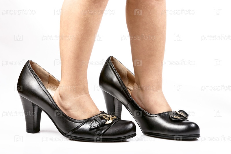 Детские ноги во взрослых женских туфлях, изолированные на белом фоне