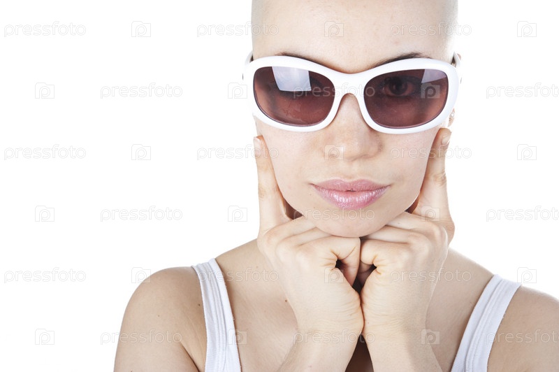Портрет лысой женщины в солнечных очках на белом фоне
