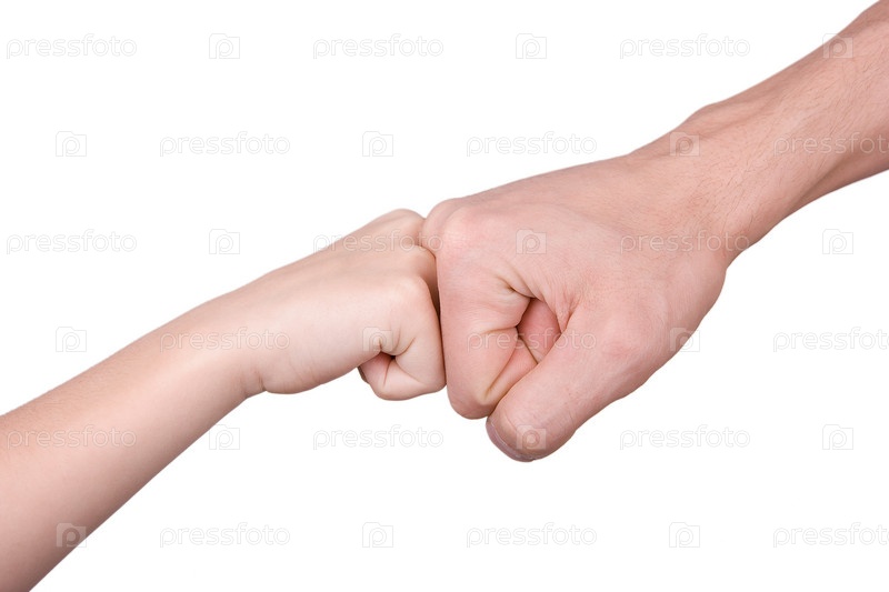 Два кулака - ребенка и взрослого - на белом фоне