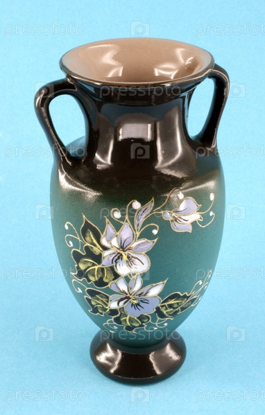 Голубая керамическая заостренная ваза на синем фоне