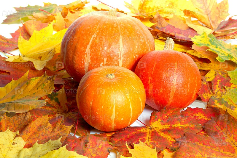 Тыква с кленовыми листьями на белом фоне