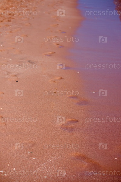 На пляже в песке видны следы человеческих босоногих